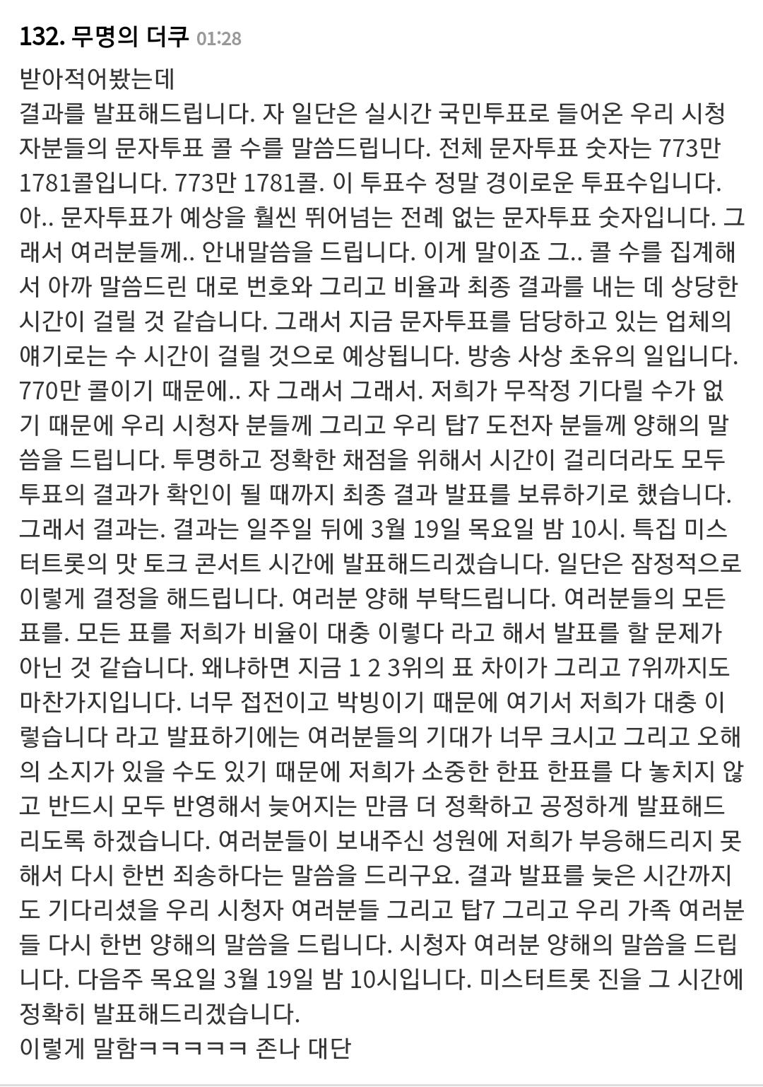 Àú°ÅÇÏ°í ´ÙÀ½³¯¿¡ ¹Ì½ºÅÍÆ®·Ô °á°ú¹ßÇ¥ÇÒ¶§ 50ºÐ ¿ø¸Ç¼îÇÔ. ¿Ö ±è¼ºÁÖ ¾²´ÂÁö ¾Ë°Ú´õ¶ó
