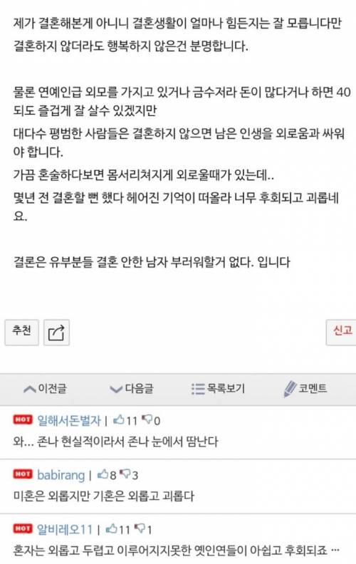 °áÈ¥Àº ÇØµµ ÈÄȸ ¾ÈÇØµµ ÈÄȸÇÑ´Ù. 40ÀÌ ³Ñ¾ú´Âµ¥ °áÈ¥ ¾ÈÇÒ°É ÈÄȸÇÏÁö ¾Ê´Â´Ù´Â°Ç º»ÀÎÀÌ ÇÏÂú°Ô º¸¿©Áö´Â°Ô µÎ·Á¿ö¼ÇÏ´Â ¿µî°¨ÀÏ »ÓÀÌ´Ù.