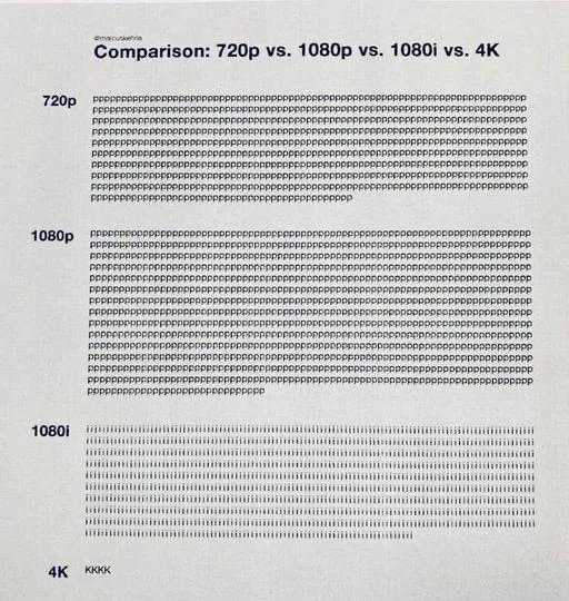 720, 1080 = ¼¼·Î ÇØ»óµµ°¡ 720Çȼ¿, 1080Çȼ¿ // 4K = ¿·ÀÇ °ø½Ä´ë·Î¶ó¸é 2160 ÀÌ¿©¾ß µÇ´Âµ¥, °¡·Î ÇØ»óµµ°¡ 3840 À̶ó 4000¿¡ À°¹ÚÇÑ´Ù°í ¸¶ÄÉÆÃ ¿ë¾î·Î 4k ¶ó°í Ç¥½Ã, ±×·¡¼ À¯Æ©ºê º¸¸é 4k ¿µ»óÀº 2160p¶ó°í µÇ¾î ÀÖÀ½. // 720p, 1080p, 2160p¿¡¼ÀÇ 'p' = ÇÁ·Î±×·¹½Ãºê(¼øÂ÷ÁÖ»ç), ÇÁ·¹ÀÓÀÇ Àüü ±×¸²À» Ç×»ó ´Ù ±×¸² // 1080i¿¡¼ 'i' = ÀÎÅÍ·¹À̽º(ºñ¿ùÁÖ»ç), ÇÁ·¹ÀÓÀÇ Àüü ±×¸² Áß ¹ÝÀ» ¹ø°¥¾Æ °¡¸é¼ ±×¸². µû¶ó¼ p(ÇÁ·Î±×·¹½Ãºê)¿¡ ºñÇØ ¿ë·®ÀÌ ÀûÀ½.