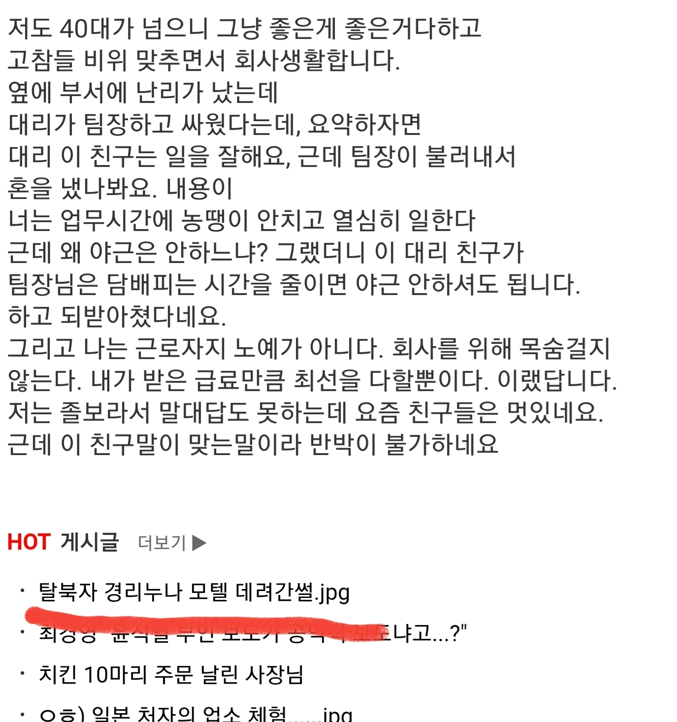 º»¹®°ú´Â ´Ù¸¥ÄÉÀ̽ºÁö¸¸.. °ü¸®ÀÚ±ÞµéÀÇ °íÃæµµ ÀÖ´Â°Ô È¸»ç Àüü¿¡¼´Â ÆÀÀüü ¾ß±Ù½Ã°£À¸·Î ÁÙ¼¼¿ì°í, ¾ß±Ù½Ã°£ ÀûÀ¸¸é ±× ÆÀ ÂÉ°í »ç¶÷»©°¡°í ±×·¯´Ï±î º¸¿©ÁÖ±â½ÄÀ¸·Î ¶óµµ ¾ß±Ù½Ã°£ ä¿öÁáÀ¸¸é Çϴµ¥ ±×°É ¹Ø¿¡´Â ´ë³õ°í ¸»ÇÒ¼ö ¾ø¾î Èûµé´Ù°í °ü¸®ÀÚ±Þ µÈ ¼±¹è°¡°¡ ¸»ÇØÁÜ..