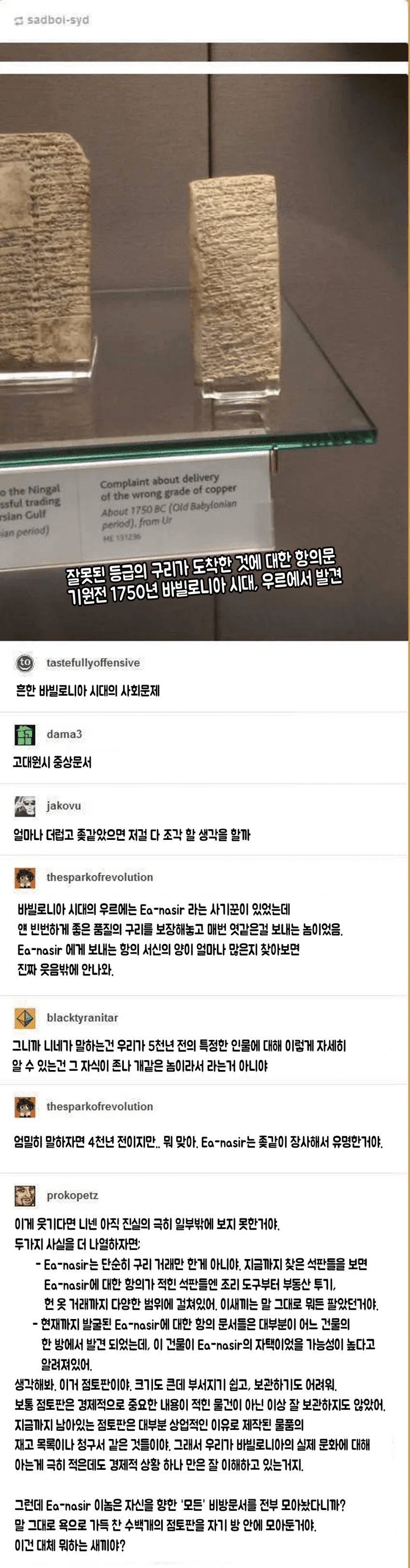 [ºÎ¿¬¼³¸í] ¿ª»ç»ó °¡Àå ¿À·¡µÈ Ç×Àǹ®Àº Çö´ë À̶óÅ© Áö¿ª¿¡ ÀÖ´Â ¿ì¸£(Ur)½ÃÀÇ ÇÑ Áý¿¡ ¹ß°ßµÇ¾ú´Ù. ¿µ±¹ °í°íÇÐÀÚ ·¹³Êµå ¿ï¸® °æÀÌ ±â¿øÀü 1970³â´ë ¹Ùºô·Î´Ï¾Æ ½Ã´ëÀÇ Ea-Nasir¿¡°Ô º¸³»´Â ºñÁî´Ï½º ÆíÁöÀÎ ¼³Çü ¹®ÀÚ ¼ÆÇÀ» ¹ß±¼Çߴµ¥, ¿©±â¿¡´Â Ur¿Í Dilmun »çÀÌ¿¡¼ ÇØ»ó ¹«¿ªÀÚÀÎ Ea-Nasir¿¡°Ô ¹ÞÀº ±¸¸®ÀÇ µî±ÞÀÌ °è¾à°ú ´Ù¸§À» Ç×ÀÇÇÏ´Â ³»¿ëÀÌ Á¡ÅäÆÇ¿¡ »õ°ÜÁ® ÀÖ¾ú´Ù. ±¸¸® ±³¿ª ¿Ü¿¡µµ ±Ý¼Ó ¿ÏÁ¦Ç°, Á¶¸®µµ±¸, Á÷¹°, ¼¶À¯ ¹× ½Ä·áǰ µîÀÇ °Å·¡°¡ Á¦´ë·Î ÀÌ·ç¾îÁöÁö ¾ÊÀÚ ÀÌ¿¡ ´ëÇØ Ç×ÀÇÇÏ´Â ¼ÆÇµéÀÌ ´Ù·®À¸·Î ¹ß°ßµÇ¾ú´Ù. Ea-Nasir´Â Æä¸£½Ã¾Æ¸¸ÀÇ Dilmun¿¡ ±â¹ÝÀ» µÐ »óÀÎ ±æµåÀÎ Alik TilmunÀÇ È¸¿øÀ̾ú´Âµ¥ Ãʱ⿡ Ea-Nasir´Â UrÀÇ ±ÃÀüÀ» »ó´ë·Î °Å·¡ÇÏ´Â ½Å¿ëµµ ³ôÀº »óÀÎÀ̾ú´ø °ÍÀ¸·Î º¸ÀÓ. ±×·¯³ª ÀÌÈÄ¿¡´Â ¾î´À ½ÃÁ¡ºÎÅÍÀÎÁö Á¦´ë·Î °Å·¡¸¦ ÇÏÁö ¾Ê¾Æ Ç×ÀÇ Á¡ÅäÆÇÀ» ¿©·µ ¹Þ¾Ò´Âµ¥ À̰͵éÀÌ ¹ß±¼µÇ¸é¼ ¾ÆÀÌ·¯´ÏÇϰԵµ ÈÄ´ëÀÇ »ç¶÷µéÀº ¹Ùºô·Î´Ï¾Æ ½Ã´ëÀÇ °æÁ¦¿¡ ´ëÇØ ÀÚ¼¼ÇÏ°Ô ¾Ë ¼ö ÀÖ°Ô µÇ¾ú´Ù.