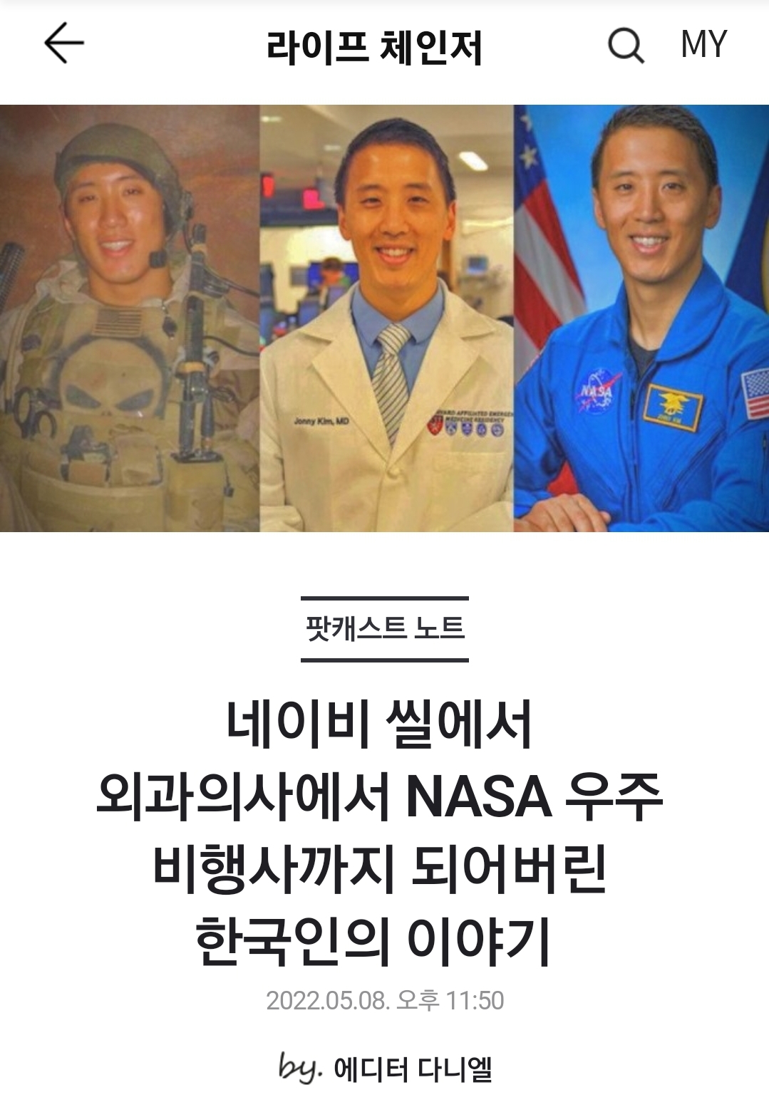 [ºÎ¿¬¼³¸í] Á¶´Ï ±è. 1984³â»ý. Çѱ¹À̸§Àº ±è ¿ë. Çѱ¹°è ¹Ì±¹ÀÎ. Çѱ¹°è ÃÖÃÊ·Î NASA ¿ìÁÖºñÇà»ç ÇÁ·Î±×·¥À» ¼ö·áÇÑ ¿ìÁÖºñÇà»ç. ºÎ¸ð´ÔÀÌ Çѱ¹°è À̹ÎÀÚ¿´´Âµ¥ Çд븦 ÀÏ»ï´ø ¾Æ¹öÁö ¶§¹®¿¡ °í±³ ¼ºÀûÀÌ ¿ì¼öÇßÀ½¿¡µµ ºÒ±¸Çϰí ÈûÀ» ±æ·¯¾ß °Ú´Ù´Â »ý°¢¿¡ ´ëÇÐ ÁøÇÐÀ» Æ÷±âÇÏ°í ±º ÀԴ븦 °á½ÉÇÔ. ¾Æ¹öÁö´Â 2002³â ¼ú¿¡ ÃëÇØ ±×¿Í ¾î¸Ó´Ï¸¦ ÆøÇàÇϰí Áý¾È¿¡¼ Ãѱ⸦ ³»çÇÏ´Ù Ã⵿ÇÑ °æÂû°ú ´ëÄ¡ÇÏ´Ù °æÂû¿¡ »ç»ìµÊ. ³×À̺ñ ¾Á¿¡¼ 100ȸ ÀÌ»óÀÇ ÀüÅõÀÛÀüÀ» ¼öÇà, Àº¼º ¹«°øÈÆÀåÀ» ¹Þ´Â µî ¼º°øÀûÀÎ ±º »ýȰÀ» ²Ù·Á³ª°¡´Ù Àü¿ì°¡ À߸øµÈ ÀÇ·áóġ·Î Á×´Â ¸ð½ÀÀ» º¸¸é¼ ¹«·Â°¨À» ´À²¼°í (Àå±³°¡ À߸øµÈ ÀÀ±Þóġ¸¦ ÇÏ´Â °ÍÀ» º¸°í Ç×ÀÇÇßÀ¸³ª '´Ï°¡ ÀÇ»ç³Ä?' ¶ó¸ç °è±ÞÀ¸·Î ´·¯¹ö¸° Àå±³ ¶§¹®¿¡ Àü¿ì°¡ °á±¹ Á×À½) °á±¹ ÀÇÇÐÀ» °øºÎÇϱâ·Î °á½ÉÇÔ. ÀÌÈÄ »÷´Ù¿¡ÀÌ°í ´ëÇп¡ ÀÔÇÐÇÏ¿© 3³â¸¸¿¡ Á¹¾÷ ÈÄ ÇϹöµå´ë ÀÇÇÐÀü¹®´ëÇпøÀ» Á¹¾÷ÇÏ¿© ÀÇ»ç ¸éÇã ¹× ÇÐÀ§¸¦ ÃëµæÇÔ. ÀÌÈÄ ¸Å»çÃßü½º Á¾ÇÕº´¿ø ÀÀ±ÞÀÇÇаú¿¡¼ ·¹Áö´øÆ®·Î ±Ù¹«ÇÏ¸ç ±ºÀǰüÀ¸·Î º¹¹«ÇÏ¸ç ¼Ò·É±îÁö Áø±ÞÇÔ.