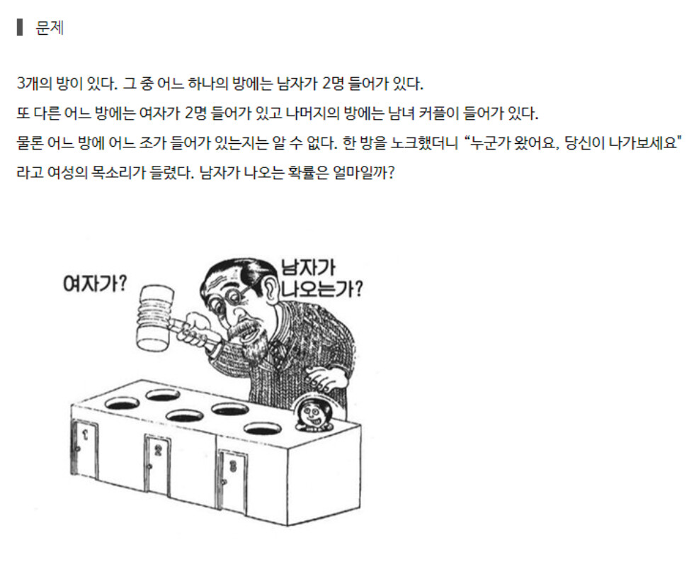 ÇØ´ç¹®Á¦´Â Á¶°ÇºÎ È®·ü ¹®Á¦·Î Ç®·Á¸é ´ÙÀ½ÀÇ °¡Á¤ÀÌ ÇÊ¿ä * ¹®À» µÎµå·ÈÀ»¶§, µÑ Áß ÇÑ»ç¶÷ÀÌ ´ë´äÇÒ °¡´É¼ºÀÌ µ¿µîÇÏ´Ù°íº¸°í ¹«Á¶°Ç ´ë´äÇÑ »ç¶÷ÀÌ ¾Æ´Ñ »ç¶÷ÀÌ ³ª¿Â´Ù°í °¡Á¤ÇßÀ»¶§ ´ÙÀ½°ú °°ÀÌ Á¶°ÇºÎÈ®·ü·Î ¹®Á¦¸¦ ÇØ°áÇÒ¼öÀÖ½À´Ï´Ù. A:³²³², B:¿©¿©, C:³²¿© ¶ó°íÇÒ¶§ (°ýÈ£¾ÈÀÇ ¼ºº°Àº ´ë´äÇÑ »ç¶÷) P(C(¿©) | B(¿©)+C(¿©)) =P(C(¿©)) / P(B(¿©)+C(¿©)) =(1/3)•(1/2) / {(1/3)•(1)+(1/3)•(1/2)} =(1/6) / (1/2) =1/3