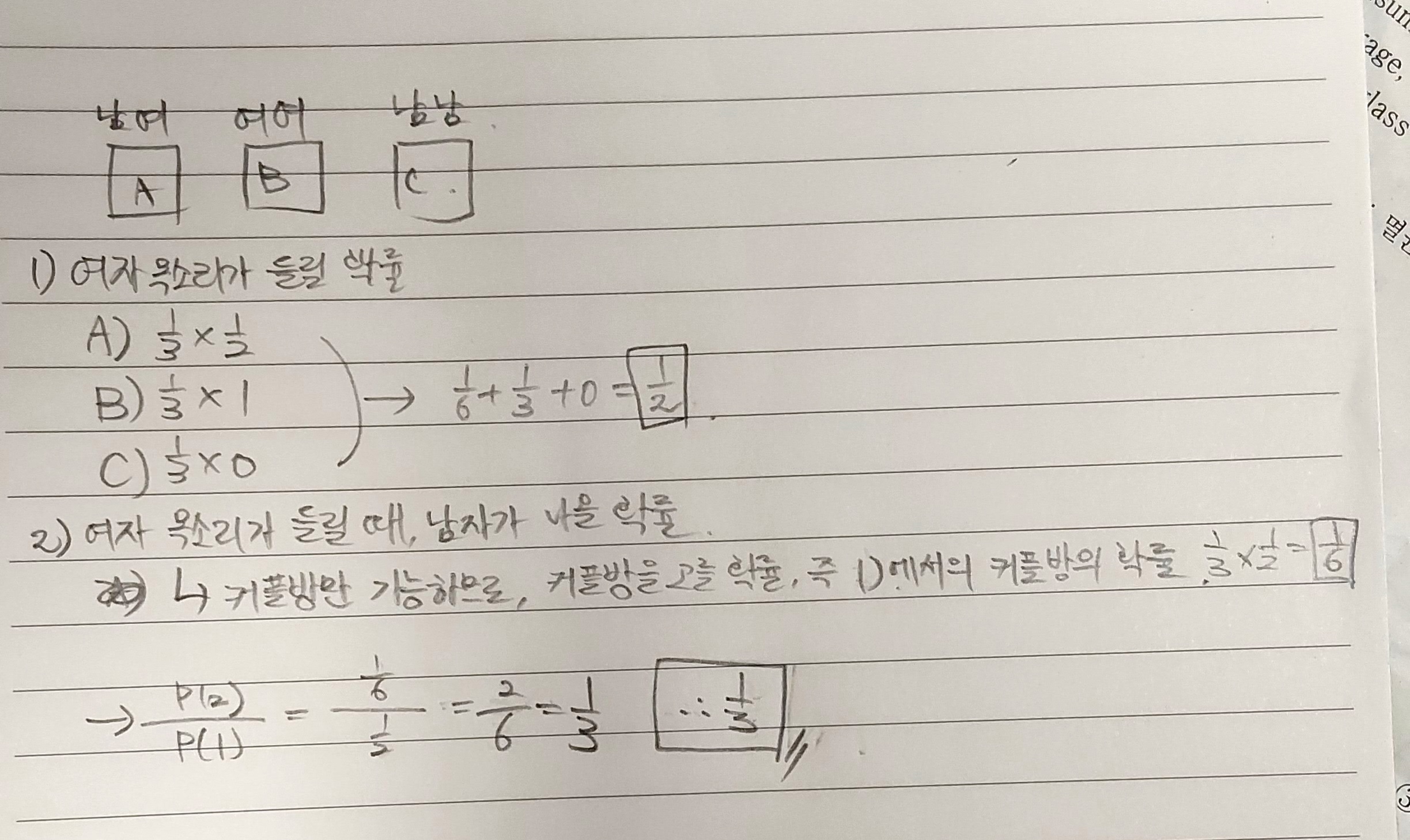 Á¶°ÇºÎ È®·üÀϽÃ, 1/2ÀÓ ¿©ÀÚ ¸ñ¼Ò¸®°¡ µé¸±È®·ü (»ç°Ça) : 2/3 ¿©ÀÚ¸ñ¼Ò¸®°¡ µé¸±¶§ ³²ÀÚ°¡³ª¿Ã È®·ü (»ç°Çb) : ¿À·ÎÁö Ä¿Çø¸ °¡´ÉÇϹǷΠ1/3 Á¶°ÇºÎ È®·üÀº b/a·Î °è»êÇϹǷΠ´äÀº 1/2 -ÀÌ»ó È®ÅëÇÏ´Â °í3-