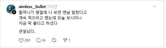 ³» ±âÁØÀ¸·Î ÇҸӴϲ²¼ Àú ¸»¾¸À» ÇϼÌÀ» ¶§´Â ³»°¡ »ìÀÌ ´õÂÈÀ» ¶§ °¡ ¾Æ´Ï¶ó ÇҸӴϲ²¼ ÀÎÁö ´É·ÂÀÌ ¶³¾îÁö½Ã¸é¼ º»ÀÎÀÇ °¨Á¤¿¡ ¼ÖÁ÷ÇØÁö±â »çÀÛÇÏ½Ç ¶§¿´Áö ±×Àü¿¡ ÀÚÆø Á÷ÀüÀÇ ¼¿Ã³·³ ºÎÇ®¾î ¿Ã¶óµµ ¿ì¸® ¼ÕÀÚ´Â Áö±ÝÀÌ Á¦ÀÏ º¸±â ÁÁ´Ù°í Çϼ̴µ¥