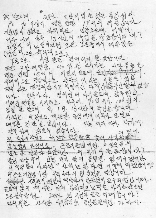 Àú´Â ¼­¿ïƯº°½Ã ¼ººÏ±¸ ½Ö¹®µ¿ 208¹øÁö 2Åë 5¹Ý¿¡ °ÅÁÖÇÏ´Â 22»ì µÈ û³âÀÔ´Ï´Ù. Á÷¾÷Àº ÀÇ·ù°èÅëÀÇ Àç´Ü»ç·Î¼­ 5³âÀÇ °æ·ÂÀ» °¡Áö°í ÀÖ½À´Ï´Ù. ÀúÀÇ Á÷ÀåÀº ½Ã³» µ¿´ë¹®±¸ ÆòÈ­½ÃÀåÀ¸·Î½á ÀÇ·ùÀü¹® °èÅëÀ¸·Î½ã µ¿¾ç Ãִ븦 ÀÚ¶ûÇÏ´Â °ÍÀ¸·Î Á¾¾÷¿øÀº 2¸¸ ¿©¸íÀÌ µË´Ï´Ù. Å« ¸¾¸ð½º °Ç¹° 4µ¿¿¡ ºÐ·ùµÇ¾î ÀÛ¾÷À» ÇÕ´Ï´Ù. ±×·¯³ª ±â¾÷ÁÖ°¡ ¿©·¯ºÐÀÎ °ÍÀÌ ¹®Á¦ÀÔ´Ï´Ù¸¸ ÇÑ °øÀå¿¡ Æò±Õ 30¿©¸íÀº µË´Ï´Ù. ±Ù·Î±âÁعý¿¡ ÇØ´çÀÌ µÇ´Â ±â¾÷üÀÓÀ» Àß ¾Ð´Ï´Ù. ±×·¯³ª ÀúÈñµéÀº ±Ù·Î±âÁعýÀÇ ÇýÅÃÀ» Á¶±Ýµµ ¸ø ¹ÞÀ¸¸ç ´õ±¸³ª 2¸¸ ¿©¸íÀ» ³Ñ´Â Á¾¾÷¿øÀÇ 90%ÀÌ»óÀÌ Æò±Õ ¿¬·É 18¼¼ÀÇ ¿©¼ºÀÔ´Ï´Ù. ±âÁعýÀÌ ¾ø´Ù°í ÇÏ´õ¶óµµ Àΰ£À¸·Î½á ¾î¶»°Ô ¿©ÀÚ¿¡°Ô ÇÏ·ç 15½Ã°£ÀÇ ÀÛ¾÷À» °­¿äÇմϱî? ¹Ì½Ì»çÀÇ ³ëµ¿À̶ó¸é ¸ðµç ³ëµ¿ Áß¿¡¼­ Á¦ÀÏ Èûµç£¨Á¤½ÅÀûÀ¸·Î, À°Ã¼ÀûÀ¸·Î£© ³ëµ¿À¸·Î ¿©¼ºµéÀº °ßµ®³»Áö ¸øÇÕ´Ï´Ù. ¶ÇÇÑ 2¸¸ ¿©¸í Áß 40%¸¦ Â÷ÁöÇÏ´Â ½Ã´Ù°øµéÀº Æò±Õ¿¬·É 15¼¼ÀÇ ¾î¸°À̵é·Î½á À°Ã¼ÀûÀ¸·Î Á¤½ÅÀûÀ¸·Î ¼ºÀå±â¿¡ ÀÖ´Â À̵éÀº ȸº¹ÇÒ ¼ö ¾ø´Â °áÁ¤ÀûÀ̰í Ä¡¸íÀûÀΠŸ°ÝÀÎ °ÍÀ» ºÎÀÎ ÇÒ ¼ö ¾ø½À´Ï´Ù. ÀüºÎ°¡ ´Ù ¿µ¼¼¹ÎÀÇ ÀÚ³àµé·Î½á ±¾ÁÖ¸²°ú ¾î·Á¿î Çö½ÇÀ» À̱â·Á°í ÇÏ·ç¿¡ 90¿ø ³»Áö 100¿øÀÇ ±Þ·á¸¦ ¹ÞÀ¸¸ç ÇÏ·ç 16½Ã°£ÀÇ ÀÛ¾÷À» ÇÕ´Ï´Ù. »çȸ´Â ÀÌ ÂøÇÏ°í ±ú²ýÇÑ µ¿½É¿¡°Ô ³Ê¹«³ª ¸ðÁú°í ¸Þ¸¶¸¥ ¸é¸¸À» º¸ÀÔ´Ï´Ù. Àú´Â ¿©±â¿¡¼­ °¢Çϲ² °£±¸ ÇÏÁö ¾ÊÀ» ¼ö ¾ø½À´Ï´Ù.