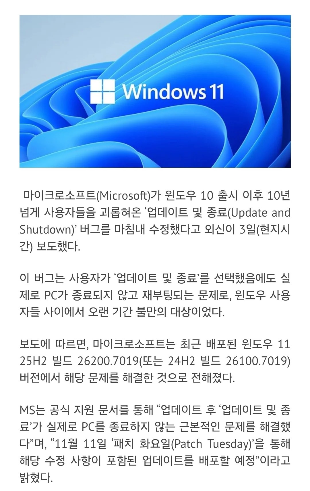 * Ãâó : https://support.microsoft.com/ko-kr/topic/2025%EB%85%84-10%EC%9B%94-28%EC%9D%BC-kb5067036-os-%EB%B9%8C%EB%93%9C-26200-7019-%E