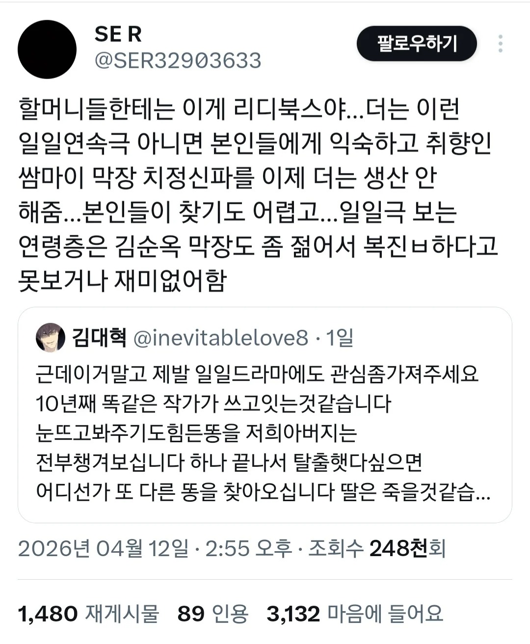 ¾ÆÄ§ µå¶ó¸¶ ¹«½ÃÇÏÁö ¸¶¶ó. 'ÀÌ°É ´ëü ¿Ö ºÁ'ÇÏ´Ù°¡ Á¤½ÅÂ÷¸®¸é ´Ù º¸°í À¯Æ©ºê·Î ¿ä¾àº» ã¾Æº¸°í ÀÖ´Ù...
