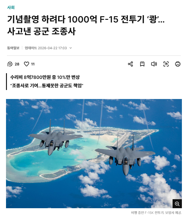 ÀüÅõ±â¸¦ ¸ô°í ¡®±â³ä ÃÔ¿µ¡¯À» ÇÏ·Á´Ù Ãæµ¹ »ç°í¸¦ ³» ±âü¸¦ ÆÄ¼ÕÇÑ °ø±º Á¶Á¾»ç¿¡ ´ëÇØ °¨»ç¿øÀÌ À¯Ã¥ ÆÇÁ¤À» ³»·È´Ù. ÇØ´ç ÀüÅõ±â´Â F-15K·Î ¾Ë·ÁÁ³´Ù.