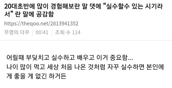 °æÇè¿¡ ´ëÇÑ ½Ç¼ö¸¦ ³Ê¹« Á÷Àå¾È¿¡¼ÀÇ ½Ç¼ö¸¸ »ý°¢¾ÈÇßÀ¸¸é ÁÁ°Ú´Ù. µ¹¾Æ¿ÀÁö ¸øÇÏ´Â 20´ë¿¡ ³»°¡ ÁÁ¾ÆÇϴ°Ϳ¡ ´ëÇÑ »ç¾÷, »õ·Î¿î »ç¶÷µé°úÀÇ ¸¸³², ¾ð¾î¹è¿ì±âµîÀÇ °æÇèÀ̶õ °æÇèµéÀº ´Ù ÇØº»´Ù¸é ³ªÁß¿¡ ²À µµ¿òµÇ´Â°æ¿ì°¡ »ý±â±â ¸¶·Ã. 30´ë,40´ë¿¡´Â Çϰí½Í¾îµµ ¸øÇϴ°æ¿ì°¡ »ý±â°í °¡Á¤ÀÌ »ý±â¸é ±×·± ½Ç¼öÇÒ °æÇèµµ Á¡Á¡ ÀҰԵǴÏ...