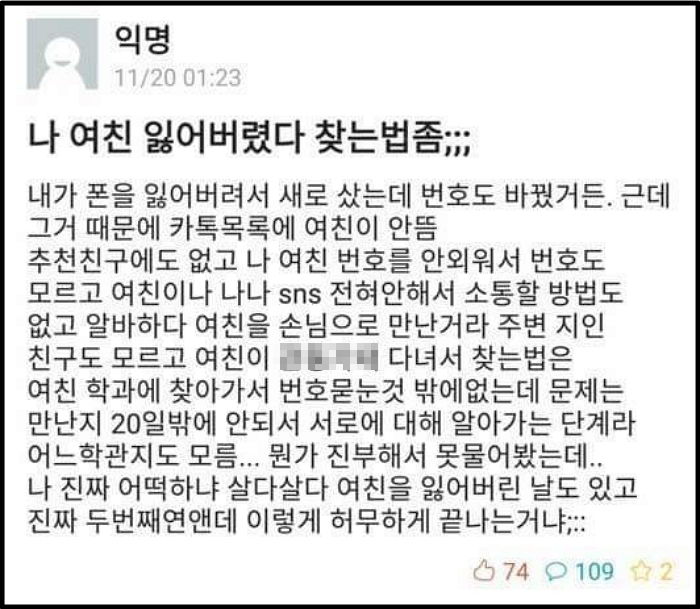 ³ªµµ ¿©Ä£ ÀÒ¾î¹ö·È´Âµ¥ ã´Â¹ýÁ»;;; ³»°¡ ÆùÀ» ÀÒ¾î¹ö¸®Áø ¾Ê°í ¾²´ø Æù ±×´ë·Ðµ¥ ¹øÈ£µµ ±×´ë·Î°Åµç. ±Ùµ¥ ±×°Å ¶§¹®¿¡ Ä«Åå¸ñ·Ï¿¡ ¿©Ä£ÀÌ ¾È¶ä... Ãßõ챏¿¡µµ ¾ø°í ¿©Ä£ ¹øÈ£µµ ¾È¿Ü¿ö¼ ¹øÈ£µµ ¸ð¸£°í ¿©Ä£À̳ª ³ª³ª sns´Â Çϴµ¥ ¼ÒÅëÇÒ ¹æ¹ýµµ ¾ø°í ¾Ë¹ÙÇÏ´Ù ¿©Ä£À» ¼Õ´ÔÀ¸·Î ¸¸³°Íµµ ¾Æ´Ï°í ÁÖº¯ ÁöÀΠ챏µµ ¸ð¸£°í ¿©Ä£ÀÌ Áö±¸ ¾îµò°¡¿¡ ´Ù´Ï±ä Çϴµ¥ ã´Â ¹ýÀº ¿©Ä£ µ¿³×¿¡ ã¾Æ°¡¼ ¹øÈ£ ¹¯´«°Í ¹Û¿¡ ¾ø´Âµ¥ ¹®Á¦´Â ¸¸³Àûµµ ¾ø¾î¼ ¼·Î¿¡ ´ëÇØ ¾Ë¾Æ°¡°í ½ÍÀº ´Ü°è¶ó ¾îµð µ¿³ÙÁöµµ ¸ð¸§...