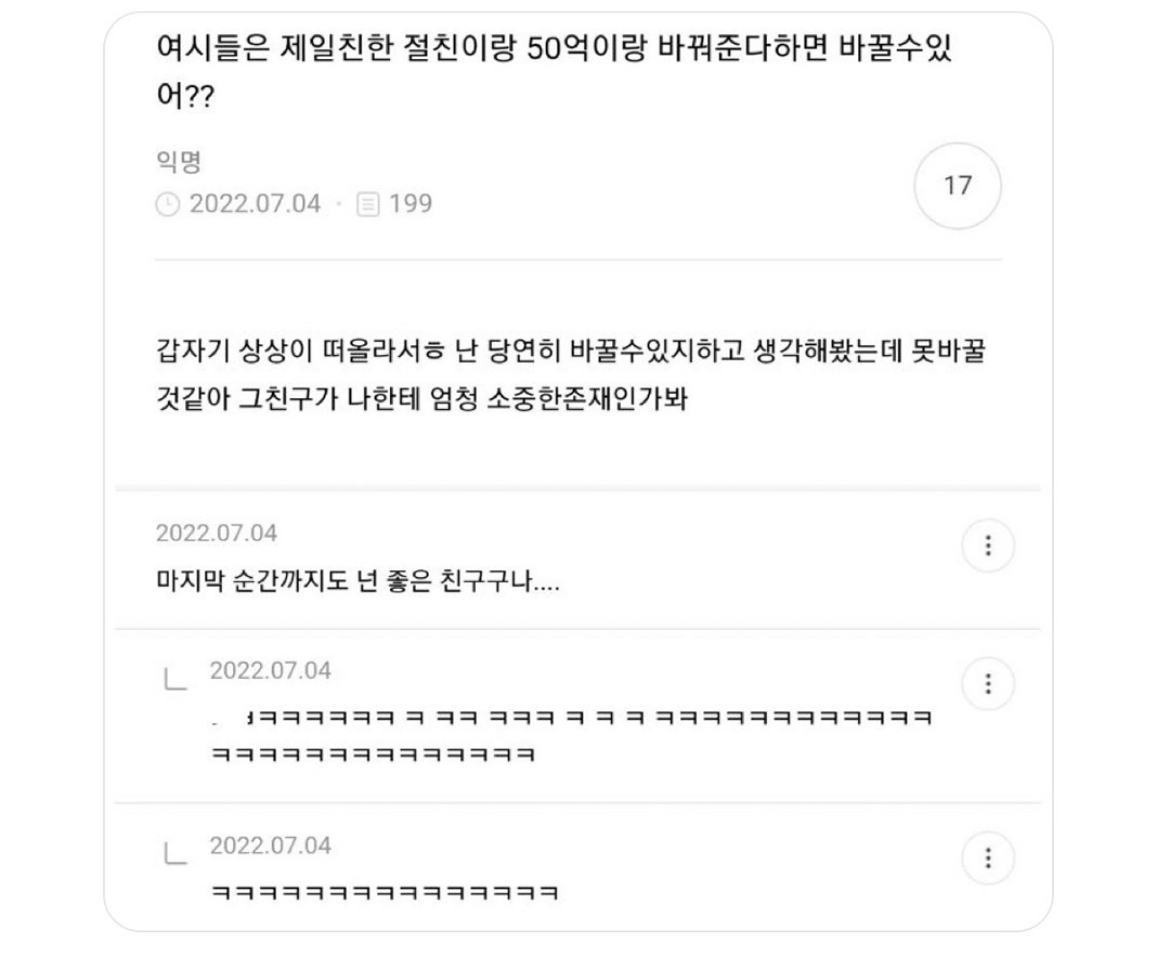 Á¦ÀÏÄ£ÇÑ Ä£±¸°¡ Á×´Â°Ô ¾Æ´Ï¶ó Àý±³¶ó¸é ³ª´Â ¹«Á¶°Ç 50¾ï ÅÃÇÏÁö µÚ¿¡ ÀÚÃÊÁöÁ¾¸»Çϰí 25¾ï Ä£±¸¿´´ø»ç¶÷¿¡°Ô ÁÖ¸é ¼ÕÇØº¼°Ô ¾ø´Â°Å ¾Æ´Ñ°¡ Çö °¡ÀåÄ£ÇÑÄ£±¸´Â ºú¿¡ Çã´öÀÌ´Â »óŶó Àο¬À» ²÷´õ¶ó°í 25¾ïÁÖ°í½ÍÀ½