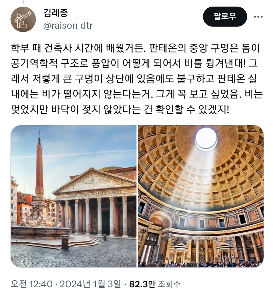 [ºÎ¿¬¼³¸í] ÀÌÅ»¸®¾Æ¿¡ ÀÖ´Â ÆÇÅ׿Â(Pantheon) ½ÅÀüÀº 2õ³â °¡±îÀÌ ¹«³ÊÁöÁö ¾Ê°í º»·¡ ¸ð½ÀÀ» À¯ÁöÇϰí ÀÖ´Â °Å´ëÇÑ µ¼ÀÌ ÀλóÀûÀÌ´Ù. ÀÌ µ¼ÀÇ Á¤»ó ºÎºÐ¿¡´Â µÕ±Ù ¸ð¾çÀÇ ±¸¸ÛÀÌ ¶Õ·Á ÀÖ´Ù. Ä¿´Ù¶õ ´«(Oculus, ¿ÀŬ·ç½º)¶ó°í ºÒ¸®´Â õÀåÀº â¹®ÀÌ ÀüÇô ¾ø´Â ÆÇÅ׿ ³»ºÎ¿¡ Á¶¸í ¿ªÇÒÀº ¹°·Ð ½ÅÀü ¾ÈÀ» ȯ±â½ÃŰ´Â Åëdz±¸ÀÇ ±â´Éµµ ÇÑ´Ù. ¶ÇÇÑ ¿ìÁÖ¸¦ »ó¡ÇÏ´Â µ¼°ú ¦À» ÀÌ·ï žçÀ» »ó¡Çϱ⵵ ÇÑ´Ù. ƯÀÌÇÑ Á¡Àº ÆÇÅ׿ ½ÅÀüÀÇ ÃµÀåÀ¸·Î ºñ°¡ µéÀÌÄ¡Áö ¾Ê´Â´Ù´Â °ÍÀÌ´Ù. ¹°·Ð À̰ÍÀº ƯÁ¤ÇÑ Á¶°ÇÀÌ ¸Â¾Æ¾ß ÇÑ´Ù. 1) ÀÔ±¸ÀÇ Ã¶¹®À» ´ÝÀ» °Í 2) ³»ºÎ¿¡ »ç¶÷µéÀÌ ¸¹À» °Í 3) ¾È¿¡ ºÒÀ» ÇÇ¿ï °Í ÀÌ´Ù. ½ÇÁ¦ ÆÇÅ׿ ½ÅÀüÀÌ »ç¿ëµÇ´ø ´ç½Ã¿¡´Â ¿Â°® Á¦¹°À» ¹ÙÄ¡°í Å¿ì´Â ÀǽÄÀ» Ä¡·¶±â ¶§¹®¿¡ ¾ðÁ¦³ª ³»ºÎ¿¡´Â ºÒ±æÀÌ ÀÖ¾úÀ¸¸ç, ÀÌ·± Å« ±¼¶Ò ¸ð¾çÀÇ ±¸¸ÛÀÌ ¾ø´Ù¸é ¾ÈÀº ÀÚ¿íÇÑ ¿¬±â·Î °¡µæÃ¡À» °ÍÀÌ´Ù. ÇÏ¿©°£ ÀÌ·± Á¶°ÇµéÀÌ ¸Â´Â´Ù¸é ÆÇÅ׿ ³»ºÎÀÇ ¸·Èù °ø°£¿¡¼ »ó½ÂÇÏ´Â ´õ¿î °ø±â·Î ÀÎÇÑ ¾Ð·Â Â÷ÀÌ ¶§¹®¿¡ ºø¹°Àº ±¸¸ÛÀ¸·Î µé¾î¿ÀÁö ¾Ê°í ±¸¸Û ¿·À¸·Î Áö³ª°¡°Å³ª ÀÚ¿¬ Áõ¹ßÇÏ°Ô µÈ´Ù.