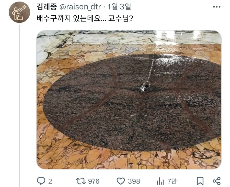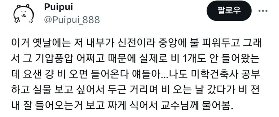 [ºÎ¿¬¼³¸í] ÆÇÅ׿ ³»ºÎÀÇ »ó½ÂÇÑ ´õ¿î °ø±â¸¦ ±¸¸Û ¹ÛÀ¸·Î ³ª°¡´Â ´ë·ù Çö»óÀÌ ÀϾ°Ô µÇ¸é¼ ÇϰÇÏ·Á´Â ºø¹°ÀÇ ¹«°Ôº¸´Ù »ó½ÂÇÏ·Á´Â °ø±âÀÇ ¾Ð·ÂÀÌ ´õ ³ô°Ô µÇ´Â °ÍÀε¥, °Å´ëÇÑ µ¼ Çϳª·Î ÀÌ·ç¾îÁø ÆÇÅ׿¿¡¼ °ø±â°¡ ÅëÇÏ´Â °÷Àº õÀåÀÇ ±¸¸Û¹Û¿¡ ¾ø´Ùº¸´Ï ´Ù¸¥ °Ç¹°µé¿¡ ºñÇØ¼ °ø±â°¡ »ó½ÂÇÏ·Á´Â ¾Ð·ÂÀÌ ¹«Ã´ °Çϱ⠶§¹®ÀÌ´Ù. ¹°·Ð ÀÌ·¯ÇÑ ½Ã½ºÅÛÀº ¸¹Àº ºñ°¡ ¿Ã ¶§´Â ¹«¿ëÁö¹°ÀÌ´Ù. ±×·¸±â ¶§¹®¿¡ ¸¹Àº ºñ°¡ ¿Ã ¶§´Â 22°³ÀÇ ¹è¼ö±¸ ±¸¸ÛÀ» ÅëÇØ¼ ¹°À» ³»º¸³»µµ·Ï ¼³°è°¡ µÇ¾î ÀÖ´Ù. (¹Ù´Úµµ ¹°ÀÌ È帣°Ô ¾à°£ ±â¿ï°Ô ¼³°èµÇ¾î ÀÖ´Ù) ¹«¾ùº¸´Ù À̰÷ ±âÈİ¡ Çѱ¹Ã³·³ ¸¹Àº ºñ°¡ ½ñ¾ÆÁö´Â ½ÄÀÌ ¾Æ´Ï¶ó °¡´Â ºñ°¡ Á¶±Ý ¿À´Â °æ¿ì°¡ ¸¹´Ù´Â Á¡µµ °¨¾ÈÇØ¾ß ÇÑ´Ù. ÀÌ·¸°Ô °Ç¹° ³»ºÎ¿Í ¿ÜºÎ °ø±â »çÀÌÀÇ ¿Âµµ Â÷¿¡ µû¸¥ ¹Ðµµ Â÷·Î ÀÎÇÑ ´ë·ù Çö»óÀÌ »ý°Ü¼ ÀÚ¿¬ÀûÀ¸·Î ȯ±âµÇ´Â Çö»óÀ» '±¼¶Ò È¿°ú(Stack Effect / Chimney Effect)' ¶ó°í ÇÑ´Ù. Æò¼Ò °Ç¹° ³» ÀÚ¿¬ÀûÀÎ °ø±âÀÇ ¿òÁ÷ÀÓÀº ´ëºÎºÐ ÀÌ·¯ÇÑ ±¼¶È È¿°ú¿¡ ÀÇÇØ ¿òÁ÷À̸ç, °íÃþ °Ç¹° ÈÀç½Ã ÀÌ ±¼¶Ò È¿°ú·Î ¿¤¸®º£ÀÌÅÍ Åë·Î³ª °è´Ü µîÀ» ÅëÇØ ¿¬±â¿Í À¯µ¶ °¡½º°¡ È®»êµÇ¾î Å« Àθí ÇÇÇØ¸¦ ÃÊ·¡Çϱ⵵ ÇÑ´Ù.