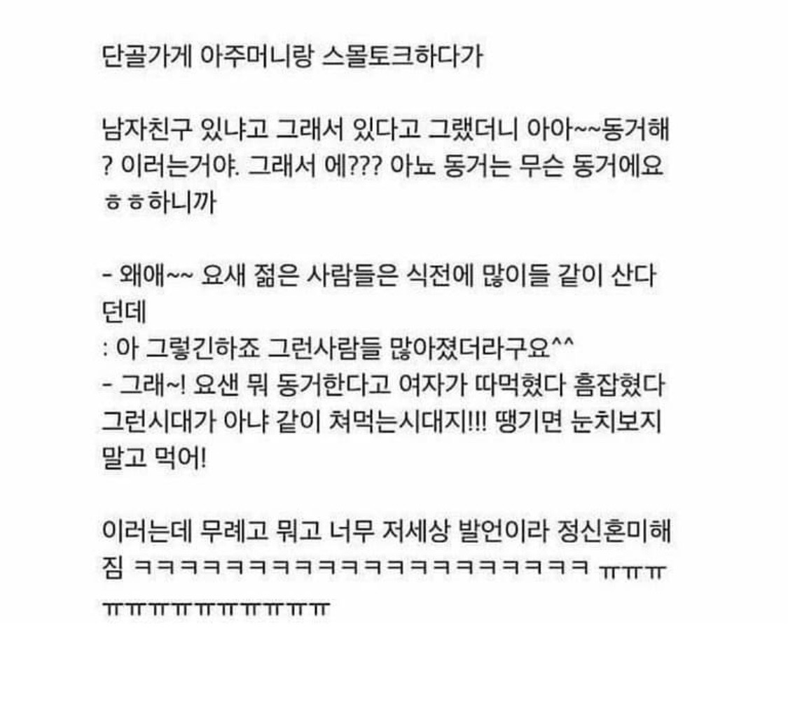 ½Å³ª¼ ¼½½ºÇÏ·¯ °¬´Âµ¥ µµÁß¿¡ °©Àڱ⠺θð´Ô µé¾î¿À½Ã¸é ¿©ÀÚ°¡ 'Áý¿¡ ºÎ¸ð´Ô ¾ø´Ù°í¸¸ ÇßÀ» »ÓÀε¥ ÀÌ ³²ÀÚ°¡ µé¾î¿Í¼ °©ÀÛ½º·¹ ´çÇѰŴÙ'¶ó°í ºÎ¸ð´ÔÇÑÅ× º¯¸íÇÏ¸é¼ ÀÚ¿¬½º·´°Ô ÁÖ°ÅħÀÔ °°£À¸·Î °í¼Ò´çÇϰí ȸ»ç¿¡¼ Åð»ç´çÇϰí 3½É °¥¶§±îÁö ÀçÃë¾÷ ¸øÇÏ°í ¹«ÁË ¶ã¶§ ÂêÀ½ ¿©ÀÚ¾Ö°¡ »ç½Ç ¾öºüº¸°í ¼ø°£ ´çÈ²ÇØ¼ ±×·¨´Ù°í ½ÇÅäÇÏ¸é¼ ´©°¡ ¿Í¼ ¼½½ºÇÏ·¨³Ä°í Ÿ¹ÚÇÔ. ¾È°¡±æ ÀßÇÔ. ¾È°¡¾ß µÊ. ÀÚÃë¹æ ºÎ¸£°Å³ª ¸ðÅÚ¹æ °¡´Â °Íµµ ¾Æ´Ï°í ºÎ¸ð´Ô °°ÀÌ »ç½Ã´Â Áý¿¡ ¿À¶ó´Â ¼Ò¸®´Â °É·¯¾ß µÊ.