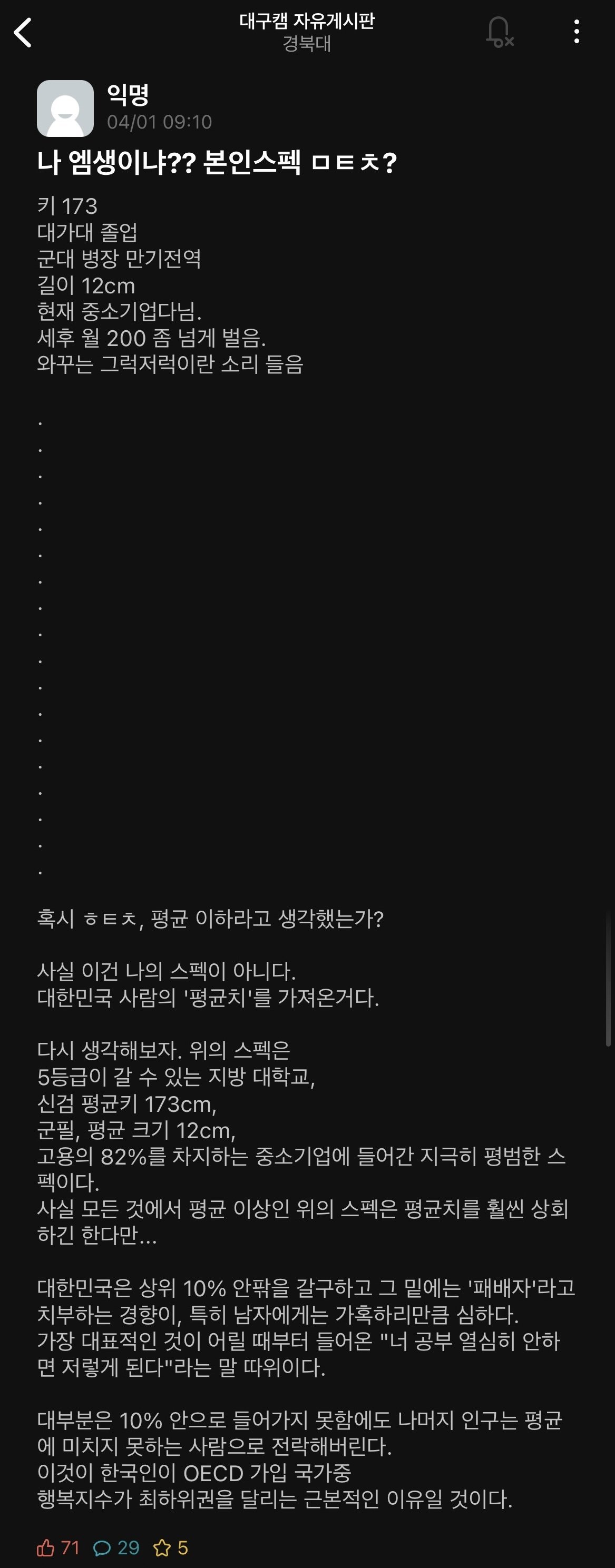 1. Ű 173 -> ¿¡ÀÌ ±×·¡µµ 180Àº ³Ñ¾î¾ßÁö // 2. Áö¹æ4³âÁ¦ ´ëÇÐ -> ¿¡ÀÌ ±×·¡µµ ÃÖ¼Ò Àμ¿ïÀº °¡¾ßÁö // 3. ±æÀÌ 12 -> ¿¡ÀÌ ±×·¡µµ 14~16´Â µÅ¾ßÁö // 4. Áß¼Ò±â¾÷ -> ¿¡ÀÌ ¾Æ¹«¸® ±×·¡µµ ´ë±â¾÷, ¸øÇصµ Áß°ß±â¾÷Àº °¡¾ßÁö // 5. ¼¼ÈÄ ¿ù 200 -> ¿¡ÀÌ ÃÖ¼Ò ¿ù 300Àº µÅ¾ßÁö ´ë±â¾÷Àº º¸³Ê½º¸¸ õ´ÜÀ§¶ó´Âµ¥ // 6. ¾ó±¼ -> ¿¡ÀÌ ±×·¡µµ ³ª Á¤µµ¸é..?¤»(´Ü, ÈÀå½Ç °Å¿ï ¾Õ ÇÑÁ¤)
