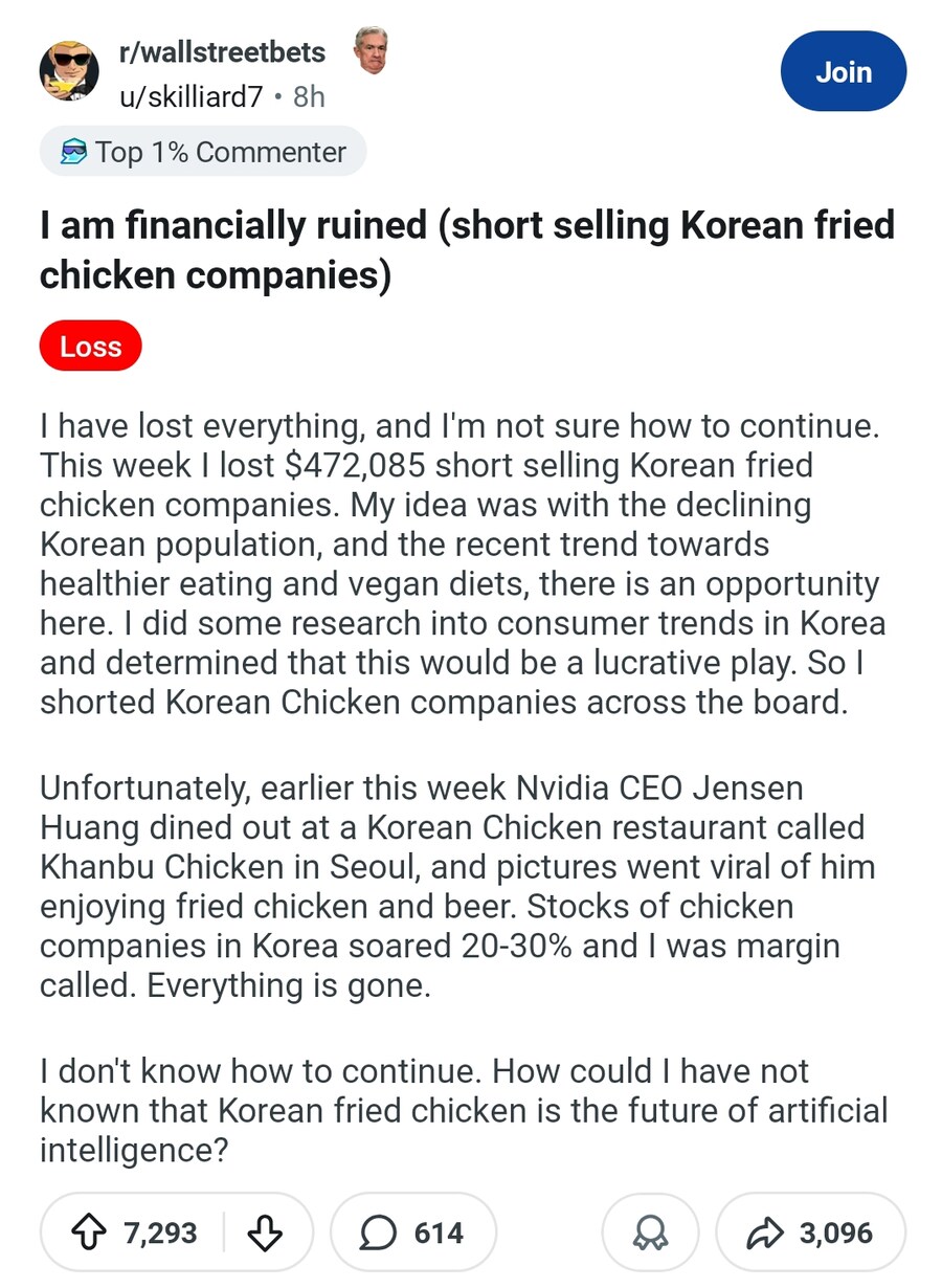¾ÈŸ±õ°Ôµµ À̹ø ÁÖ ÃÊ, Á¨½¼ Ȳ ¿£ºñµð¾Æ CEO°¡ ¼¿ïÀÇ ±ñºÎġŲÀ̶ó´Â ÇѽĴ翡¼ ¿Ü½ÄÀ» ÇÏ¸é¼ ÇÁ¶óÀ̵å ġŲ°ú ¸ÆÁÖ¸¦ Áñ±â´Â ¸ð½ÀÀÌ ´ã±ä »çÁøÀÌ ÀÔ¼Ò¹®À» ÅÀ½À´Ï´Ù. Çѱ¹ÀÇ Ä¡Å² ȸ»ç ÁÖ°¡°¡ 20~30% ±ÞµîÇß°í ¸¶Áø ÄÝÀ» ¹Þ¾Ò½À´Ï´Ù. ¸ðµç °ÍÀÌ »ç¶óÁ³½À´Ï´Ù.