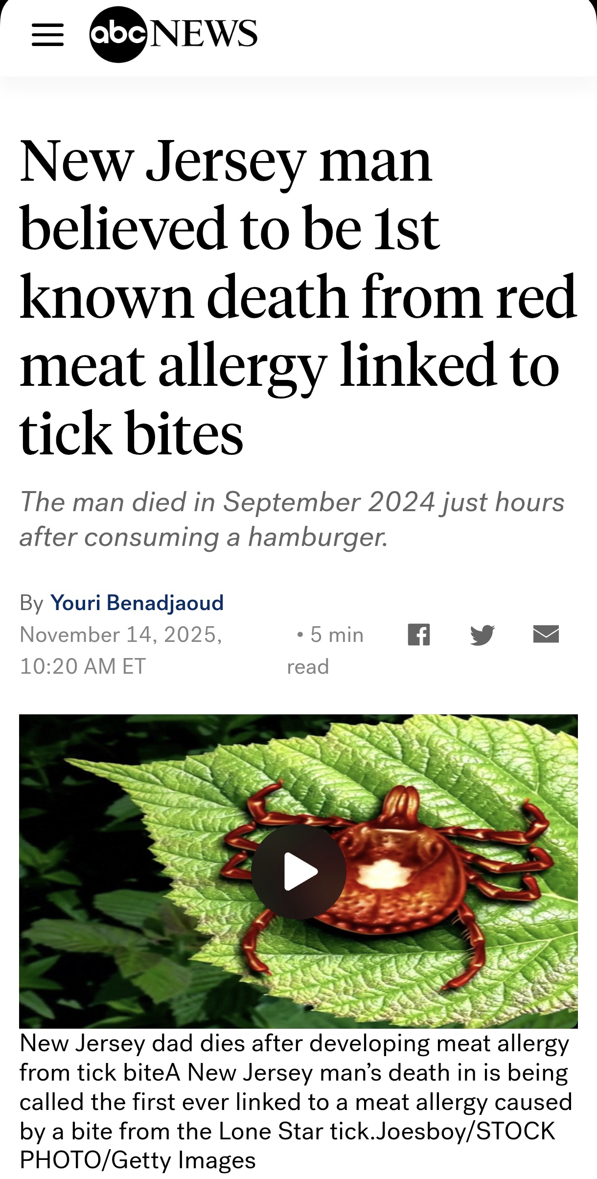 * Ãâó : https://abcnews.go.com/amp/Health/new-jersey-man-believed-1st-death-red-meat/story?id=127524339