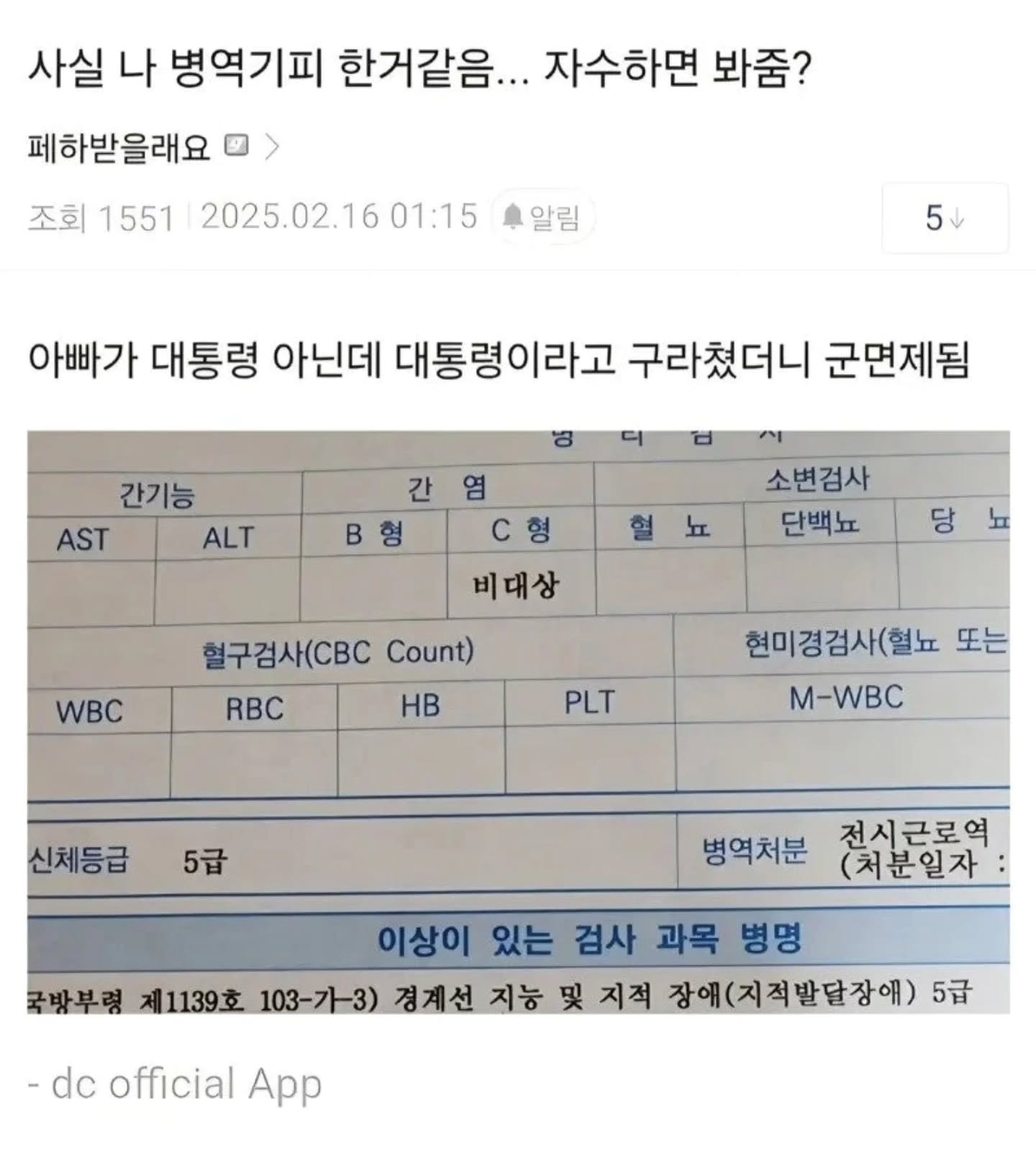 °æ°è¼º Áö´ÉÀ¸·Î´Â Áߵ(´Ù¸¥ Á¤½Å°Ç°ÀÇÇаú ÁúȯÀÌ µ¿¹ÝµÇ¾î Ä¡·á¸¦ ¹Þ°í Àְųª »çȸÀû¤ýÁ÷¾÷Àû ±â´É Àå¾Ö°¡ ÇöÀúÇÏ¿©, ±ºº¹¹«¿¡ ÁöÀåÀÌ ÃÊ·¡µÈ´Ù°í ÆÇ´ÜµÇ´Â °æ¿ì): 5±Þ ÀÌ·¸°Ô µÇ¾ßÇÔ. ´Ï°¡ Ãë¾÷ÇØ¼ ÀÏÇÒ¼ö ÀÖ´Â Á¤µµ¸é »çȸ»ýȰ Àß Çϰí Àִ°Ŵϱî ÇØ´ç ¾ÈµÊ. ¾Æ¸¶µµ º»¹®Àº ¾Æºü¸¦ ´ëÅë·ÉÀ¸·Î ¾µÁ¤µµ´Ï µÚ¿¡ÀÖ´Â ÁöÀûÀå¾Ö·Î ¾È°¬À»°ÅÀÓ. IQ 70 ÀÌÇÏÀÓ.