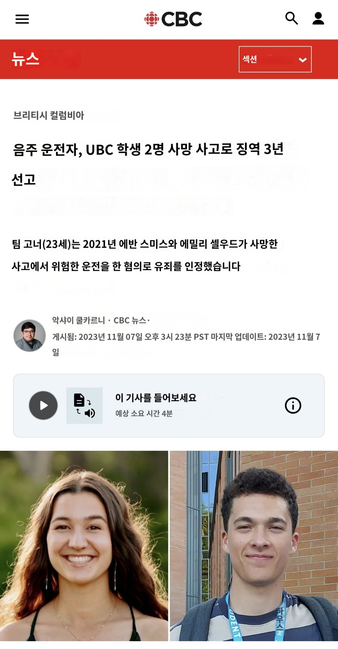±â»ç±îÁö ³µ¾ú³×... 2021³â 9¿ù 21ÀÏ, UBCÀÇ ±¹Á¦ÇлýÀÎ ÆÀ °Å³Ê´Â Ä·ÆÛ½º ³» Á¦ÇѼӵµ 40km/h ±¸°£ÀÎ ³ë½º¿þ½ºÆ® ¸Ó¸° µå¶óÀ̺ê(Northwest Marine Drive)¿¡¼ ½Ã¼Ó 100~120km·Î ¿îÀüÇϰí ÀÖ¾ú½À´Ï´Ù. ¿ÀÀü 1½Ã 45ºÐ°æ, ±×ÀÇ Â÷·®Àº µµ·Î ¿·À¸·Î ¹þ¾î³ª º¸µµ¿¡ ÀÖ´ø 18¼¼ Çлý µÎ ¸í — ¿¡¹ø ½º¹Ì½º(Evan Smith)¿Í ¿¡¹Ð¸® ¼¿¿ìµå(Emily Selwood) — À» Ä¡¾î ¼ûÁö°Ô Çß½À´Ï´Ù. °Å³ÊÀÇ Â÷·®Àº °¡·ÎµîÀ» µéÀ̹ްí, ÀÌ¾î ¹ÙÀ§¿¡ Ãæµ¹ÇØ °øÁßÀ¸·Î ¶°¿Ã¶úÀ¸¸ç, µÚ¿¡¼ ÇÇÇØÀÚµéÀ» µ¤ÃƽÀ´Ï´Ù.