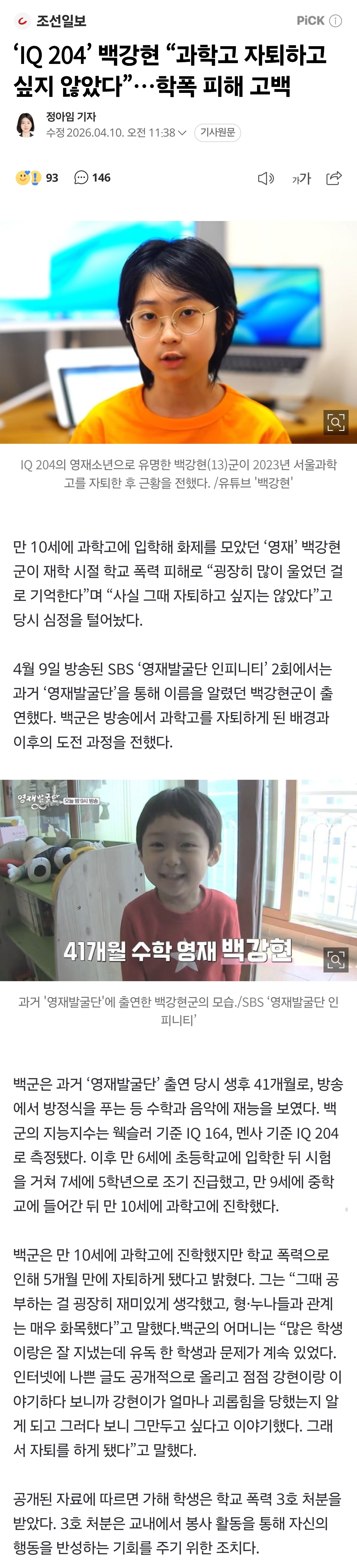 ¡®IQ 204¡¯ ¹é°Çö ¡°°úÇаí ÀÚÅðÇÏ°í ½ÍÁö ¾Ê¾Ò´Ù¡±¡¦ÇÐÆø ÇÇÇØ °í¹é