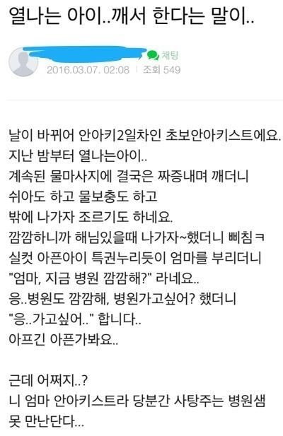 ÁøÂ¥ ¾Ö ³º±â Àü¿¡µµ ¾È¾ÆÅ°µé ÁøÂ¥ °³¿ª°Ü¿ü´Âµ¥ µþ¾ÆÀÌ Ãâ»êÇϰí ÀÎÈÄ¿°À¸·Î º´¿ø ¸îÀÏ ÀÔ¿øÇÏ°í ¿¬´Þ¾Æ Àå¿°À¸·Î ¸î³¯ °í»ýÇÏ°í³ª´Ï ±Û¾´ÀÌ´Â Áø½É ¾Æµ¿Çдë¹ü ¸Â´Ù ¾ÆÀ̸¦ À§ÇÑ´Ù´Â ÀÌÀ¯·Î ÀÚ½ÅÀÇ ¹«ÁöÇÔÀ» µ¤À¸·Á ÇÏ´Â ÇൿÀÌ ³Ê¹« ¿ª°ã°í ÀÜÀÎÇÏ´Ù