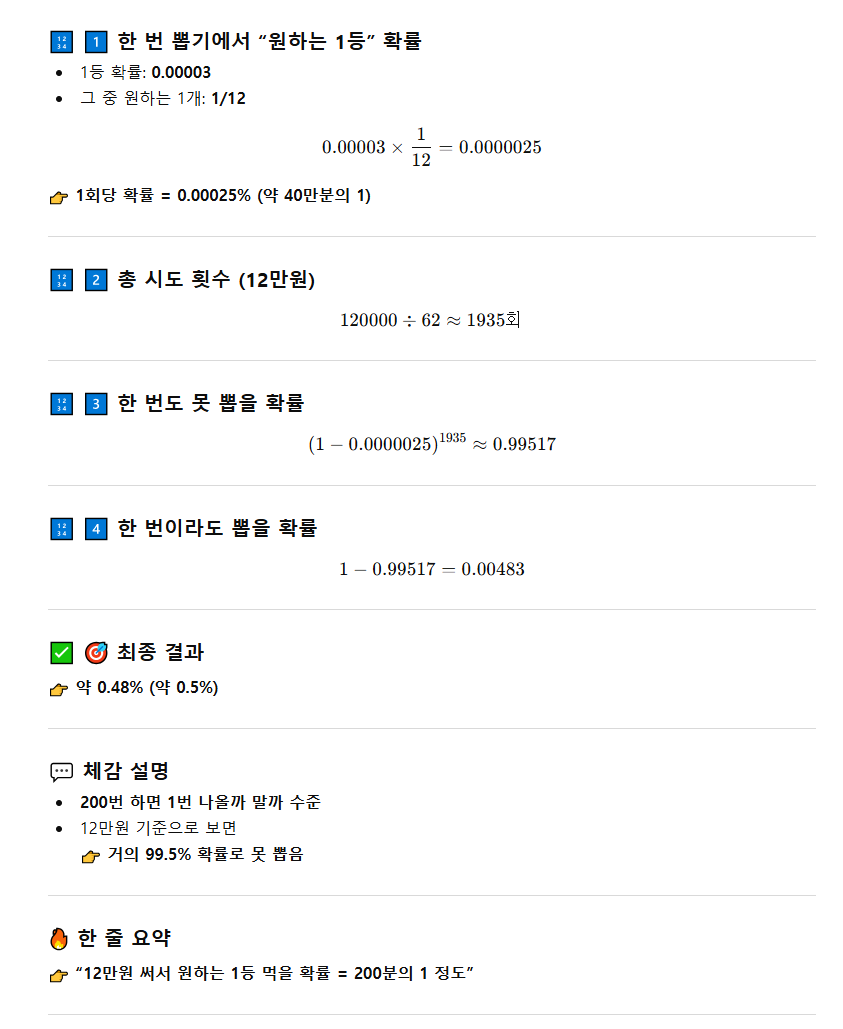 0.003% ÇÏ´Â °¢ µ¶¸³½ÃÇàÇÏ´Â »Ì±â¿¡¼ 1µîÀ» »ÌÀ»È®·ü ±×¸®°í 1µî»óǰÀÌ 12°³¶ó´Â °¡Á¤ÇÏ¿¡ ³»°¡ ¿øÇÏ´Â »óǰÀ» ¸ÔÀ» È®·ü ..