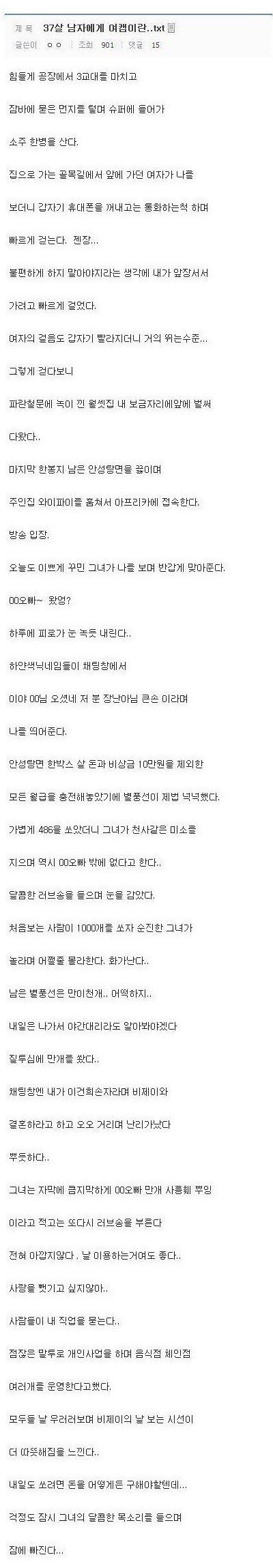 ÀúÁ¤µµ ¿Ü·Î¿òÀº ÁøÂ¥ ´À²¸º¸Áö ¾ÊÀ¸¸é °ø°¨Çϱâ Èûµé´Ù. »è¸·ÇÑ °øÀåÀÏ ¸öµµ Èûµçµ¥ ¸¶À½µµ ÆíÄ¡¾Ê°í Àϳ¡³ª°í Áý°¡¸é Áýµµ Ç㸧ÇÑ ¿ø·ëÀε¥ ³Ã±â¸¸ÀÌ È帥´Ù. ³»°¡ Áý¿¡ µé¾î°¥¶§ ºñÃß´Â ½Å¹ßÀå ´©·±Àü±¸¸¸ ÄÑÁú¶§ ±× °í¿äÇÔÀº ³¯ ´õ¿í ¿Ü·Ó°Ô ¸¸µç´Ù. ¼¼»ó¿¡ ³ª¸¸ ÀÖ´Â ´À³¦. ¹æ ºÒÀ» Ű°í ¾ÄÀ» Áغñ¸¦ Çϴµ¥ ±ô¹ÚÇÏ°í »¡·¡¸¦ ¾È³Î¾î ³ö¼ ¸¶¸¥ »¡·¡°¡ ¾ø´Ù. ÄòÄòÇÑ ³¿»õ ¶§¹®¿¡ ´Ù½Ã ¼¼Å¹±â¿¡ »¡·¡¸¦ ³Ö°í µ¹¸° ÈÄ ¾îÁ¦ ÀÔ¾ú´ø ³»º¹À̳ª ÀÔ¾î¾ß°Ú´Ù ´Â »ý°¢À» ÇÏ¸ç ¼ö°ÇÇÑÀåµé°í ¿å½Ç¿¡ µé¾î°£´Ù. »þ¿ö±â¸¦ Ʋ¾î³õ°í °¡¸¸È÷ ¸Û¶§¸®°í Àִµ¥ ±×³É ´«¹°ÀÌ ³µ´Ù. ÀÌ·¸°Ô »ì´Ù°¡ ±×³É Á״°ǰ¡? ÀÌ ¼¼»ó¿¡ ÅÂ¾î³ ÀÌÀ¯°¡ ¹¹Áöᆢ º°¿¡ º° »ý°¢ÀÌ ´Ù µé´Ù°¡.Á¤½Å °¡´Ùµë°í ¾Ä°í ³ª¿Í¼ ¾îÁ¦ ÀÔ´ø ³»º¹°ú ¼Ó¿ÊÀ» ÀÔ°í À̺Ҽӿ¡ µé¾î°¬´Ù. ¿ô´ëº¸¸é¼ È÷È÷´ö ´ë´Ù°¡ ÇǰïÇØ¼ ÆùÀ» ÃæÀü½ÃŰ°í ´«À» °¨¾Ò´Ù. 'Â÷¶ó¸® ³»ÀÏ ±ú¾î³ªÁö ¾ÊÀ¸¸é ÁÁ°Ú´Ù, Àáµé µíÀÌ ÆíÇÏ°Ô Á×À¸¸é Á¤¸»ÁÁ°Ú´Ù.' µé¾îÁÙ »ç¶÷Çϳª ¾ø´Âµ¥ ±¦È÷ Áß¾ó°Å¸°´Ù.